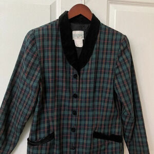 Vintage Northern Traditions Green Plaid Velvet Trim Long Line Button Front Dress Coat Holiday Classic Christmas