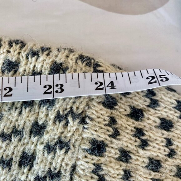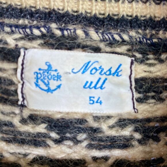Vintage Norwegian wool fisherman's sweater, size 54 (L), unisex. Cream with traditional dark grey pattern, stripes at turtleneck collar, and hems. Beautiful vintage condition, super warm 100% wool. Made by Pedek, a label without a ton of info online but I did see there is one in a museum thought to be knitted pre-1940. Measures 24 inches across shoulders, 24 inches across chest, and length of sweater from shoulder to hem is 27 inches. Cat friendly, nonsmoking home.