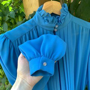 Lightweight and unlined, it may require a shift underneath. Matching decorative buttons on collar and sleeve. Belt is very sturdy and can be swapped out with something else for a personal flair!