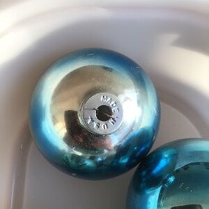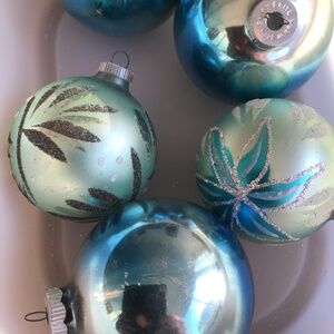 Here 5 ornaments are all vintage. The ones that have been hand painted are from West Germany while the 3 inch ornaments are made by Shiny Brite. All are in fair vintage condition.