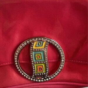 Vintage shoulder bag by Claudio Orciani in pink patent leather. Enamelled buckle closure (missing one rhinestone) with magnetic fastening. The bag is in very good overall condition. The chain is also in good condition.