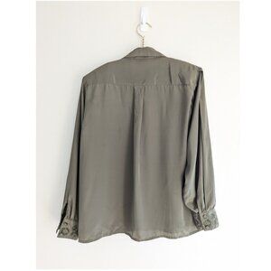 This olive tone relaxed fit vinatge blouse is a stunner! Look at those eyes! Tonal embroidered thread with beading within the leopard spots - truly a one of a kind gem! Embroidery on wrist cuffs as well. Button down front with tonal fabric buttons. Light shoulder pads. Last photo shows the other side of embroidery.