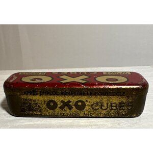 This vintage OXO Cubes tin box features a nostalgic retro design in red and gold, ideal as a collectible or decorative item. Compact and durable, it adds a touch of history to your collection.