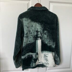 Vintage Ocean East Lighthouse Fleece Cardigan Womens S Green 90s Granny AOP