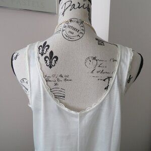 Lovely off white/cream full slip with a wide lace V neck that carries up to the shoulder seam. This slip is a Women's Size 38. I have included further measurements below to ensure a good fit. The fabric is 100% polyester and is machine washable. This slip was Made In Canada. The brand is Impromptu.