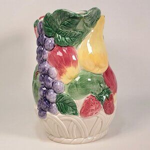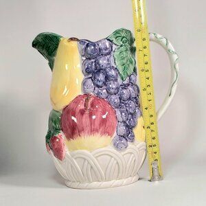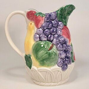 Add a touch of vintage charm to your home with this beautiful Ogatari embossed fruit pitcher, made in Japan. This is the larger version of this design, standing 8 inches tall, whereas the standard size measures approximately 5 inches. The pitcher features a richly textured, raised fruit motif — grapes, pears, apples, and leaves — highlighted with hand-painted details that showcase its craftsmanship.