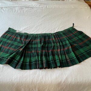 Gorgeous electric green tartan with black and red accents. Wrap style with faux leather clasp at waist and oversized pin to secure at the back. This was gifted to me by a friend (which she wore to Scottish events in Montreal in the 70s and 80s). Was originally full-length and hemmed to be more wearable every day. Excellent vintage condition, with no holes or pulling. The waist is adjustable, but would best fit a XS-S.