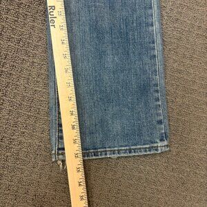 Has a stain on the front of leg and some distressing throughout and the back belt loop is detached. Please view photos for details and measurements