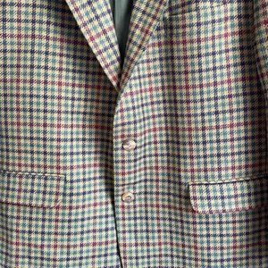 Bring the neo-British charm to your wardrobe with this elegant vintage Old River blazer featuring a houndstooth pattern and leather elbow patches. Houndstooth pattern in green, red and blue. Size 42 Canada, 52 Europe.