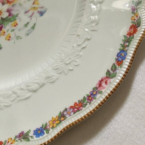 Good preowned vintage condition, white dinner plate with floral relief, and gold accented trim by Old Staffordshire Johnson Brothers of England for their 'Marlow' series. Designed and produced in England. Unique shaped trim. Gorgeous floral motif and illustration at the center. Plate 3/6.