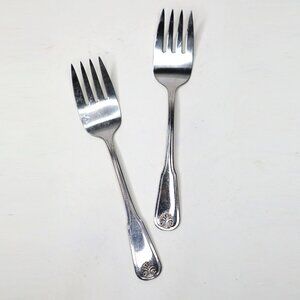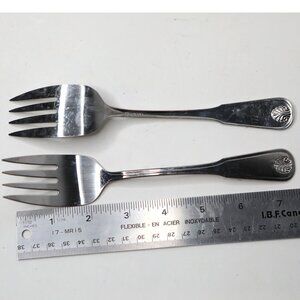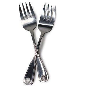 This is a beautiful pair of vintage large serving forks in the classic Classic Shell pattern by OneidaCraft Deluxe Stainless. This traditional colonial design features an elegant scallop shell and delicate scrollwork at the tip of the handle.