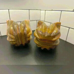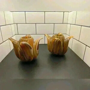 Two Alabaster Marble Onyx Tulip Candle Holders Hand Carved. The candles holders are unique and cute that will add any unique detail to a room. The items do no have any obvious flaws.