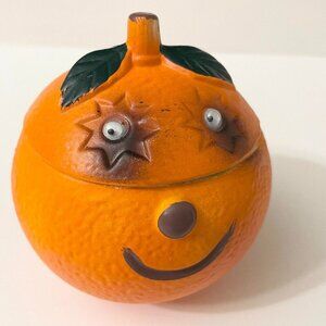 Vintage Orange Anthropomorphic Smiling Fruit Ceramic Sugar Bowl Googly Eyes