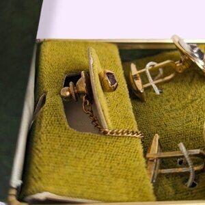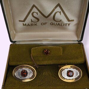 This vintage cufflink and tie pin set is made of gold and silver tone metals and orange glass, and comes in its original box (green, hardshell). The cufflinks are long ovals, and each consist of a gold tone layer, a silver tone layer, and then the orange glass. The tie pin is a single orange glass stone with a chain in back. The set has normal vintage wear but would benefit from a rinse and clean.
