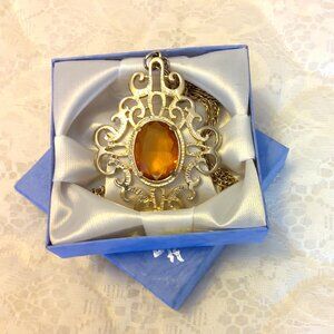 Vintage Orange Yellow Crystal Large Gold Tone Pendant Gold Tone Long Necklace
