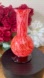 This striking vintage art glass vase features a rounded base with a tall flared neck and a clear applied handle. Its vivid orange and white spatter design creates a marbled swirl effect, while the deep orange-red pedestal base provides a bold foundation. A beautifully balanced hand blown piece that combines artistry and function, perfect for display or use.