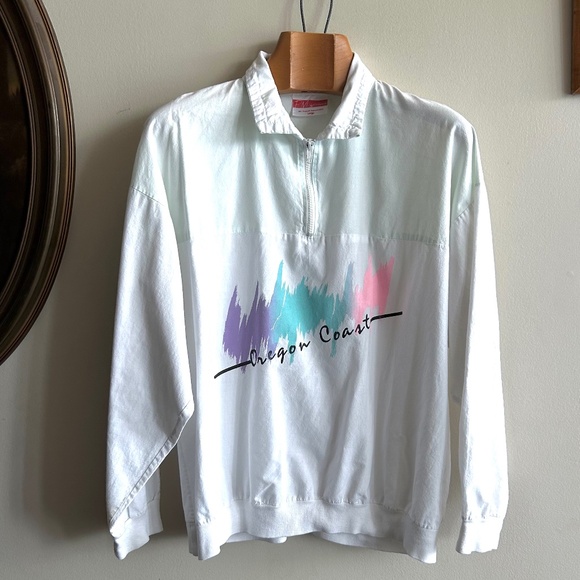 Channel all the retro summer vibes with this authentic vintage Oregon Coast quarter-zip pullover. Made in the USA from soft, preshrunk cotton, this piece features a high zip-up collar and a bold pastel brushstroke graphic in purple, teal, and pink. Lightweight but cozy, it’s the perfect layer for breezy beach nights or casual vintage styling.