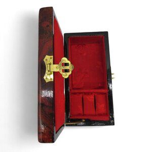 Vintage Chinese lacquered wooden jewelry box featuring a metal latch.