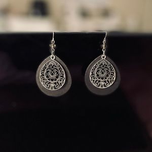 Vintage Ornate Earrings w/ Wood, Single Bead and Silver Tone