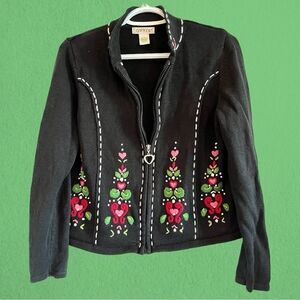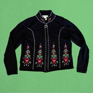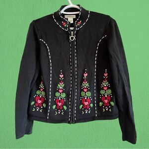 Adorable vintage zip up cardigan from Orvis. Black with colourful embroidered detail. Zips up with a cute heart charm. Size small, true to size. Great condition!
