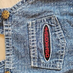 Vintage OshKosh B'Gosh Denim Short Overalls. have a white crossed pattern on them, very subtle. made in Canada. size 24 months