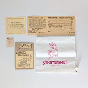 Vintage Osrow Steamstress II steam iron for sewing or travel. Model SB-75. From the 1970s. Comes with the original box, instructions, warranty card, salt packet, and travel bag. Missing the measuring cup and measuring spoon.