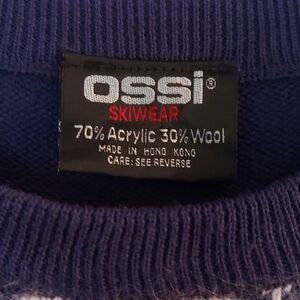 Vintage Ossi Ski Wear Fairisle Knit Sweater Acrylic and Wool Blend Size Small. Navy with Aqua and White Fairisle Pattern. Excellent like new condition.