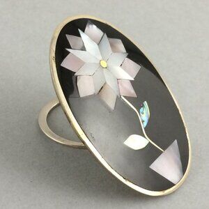 Piece is Vintage and Used. Has Damage. Metal has Scratches, Darkening, Wear and Cloudiness Throughout. Border with Enamel has Spots of Tarnish, Discolouration and Noticeable Wear. Light Scratches to Black Background Area and Abalone Insets. Edging is Uneven, Not a Smooth Oval Shape.