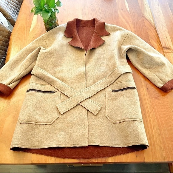 Chic woolen jacket with a belt. The size is L but would look good on someone who wears M.