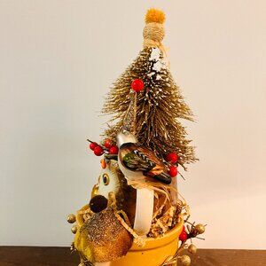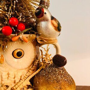 This tabletop or mantle piece features a vintage Owl figurine, vintage ornaments, and a velvet mushroom. If you love owls this is the Christmas fun you've been looking for! All decked out for the holidays.