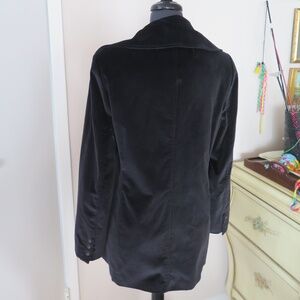 This listing is for a vintage Pasha & Jo black cotton stretch velvet jacket in a size 12 (US). This classic jacket features a pea coat style with an overized collar and a below hip-length hem. The jacket has a double breasted button closure, and is lined with acetate. This sporty yet sophisticated piece is suitable for various occasions from casual to dressy.