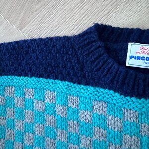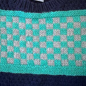 Vintage French PINGOUIN Paris handmade, Chunky knit sweater with rib knit collar, cuffs and hem in rich navy with turquoise and grey checker board design.