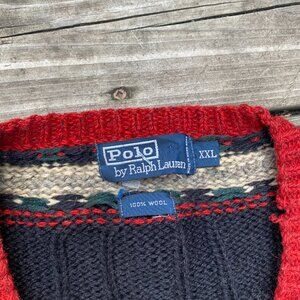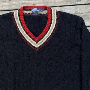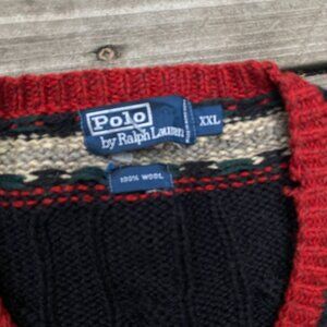 Vintage POLO RALPH LAUREN Wool Sweater Cable Knit V Neck Fair Isle XXL Black