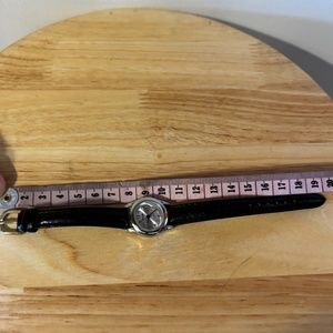 Vintage Pacer black leather strap mother of pearl mini wrist watch in excellent used condition (as new). Stainless steel, strap might be real leather but I’m not sure, analog display, mother-of-pearls face, made in Singapore, feminine and cute. It works well and the battery is new. This item comes from a smoke free, pets friendly home. Recycled bags/box used when possible. Please, let me know if you'd like any additional info and thanks for watching!