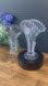 This pair of vintage clear glass fan vases features elegant Cornflower-style etching, likely by W.J. Hughes. The tall fan form is accented with bubble beading along the edges, giving them both sparkle and texture. These are timeless Canadian glass collectibles that work beautifully as decorative accents or functional flower vases.