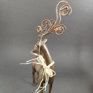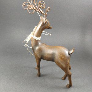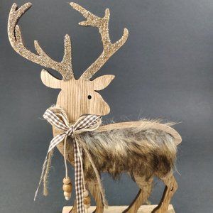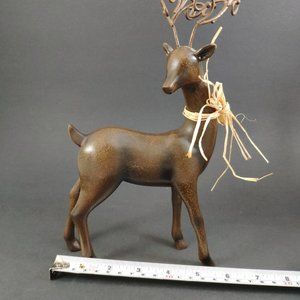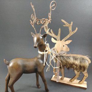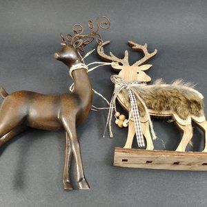 Set of 2 Reindeer Deer Elk, Christmas Figurines. Brown one is Heavy Resin and Metal 10.75 inches in height and 7 inches in width Tail to Antler, Beige Wood one has Faux Fur and Glitter, and slotted to base, 9.25 in height and 7inches in width