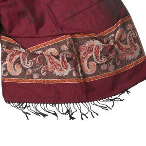 Wide paisley patterned scarf that can easily double as a shoulder wrap when you need a little more warmth. Maroon base with black paisley print and paisley print on ends.