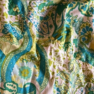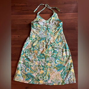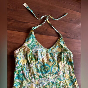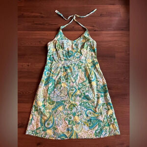 Cute summer halter vintage cotton dress with a bit of stretch. Blue/Green/Yellow paisley pattern throughout the dress.