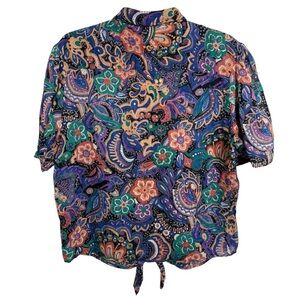 Vintage Paisley Tie Front Shirt Size Medium Cotton Boho Short Sleeve Top