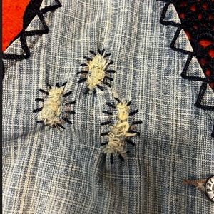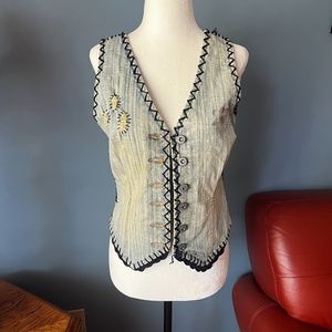 Vintage Parasuco distressed denim and crochet vest in very good used condition. V neck, slightly stretchy, distressed details on chest, crochet trims and back. The crochet part seems to have some loose threads, sold as is. Bohemian festival vibe. Marked size M but fits smaller in my opinion, as vintage items often do, please check measurements. All measurements are approximate and taken with the garment laying flat: Armpit to armpit 15" Total length 21". This item comes from a smoke free, pets friendly home. Recycled bags/box used when possible. Please, let me know if you'd like any additional pictures and/or measurements or other info. Thanks for looking!