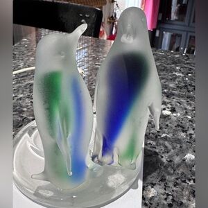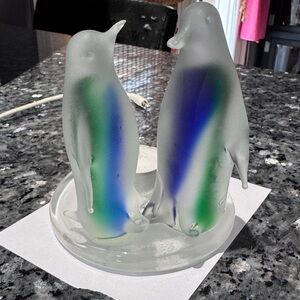 Bring a splash of arctic charm into your home with this adorable PartyLite frosted glass penguin duo! Featuring a frosty finish with vibrant green and blue accents, these two penguins stand together on a clear glass base, ready to light up your space with cozy glow. Perfect for tea lights or votive candles.