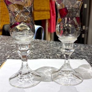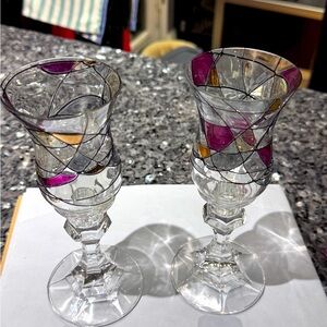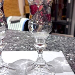 ✨ Vintage. Rare find. These are retired, only available now in the secondary market. 4" hand blown glass tea light or votive candle holders with hand painted stained glass. Sitting on clear glass stems. Excellent condition.