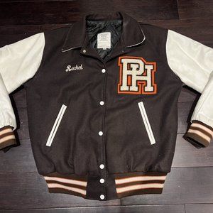 Vintage Pascack Hills School Varsity Jacket, collar-styled varsity jacket, chenille embroidery patches front and back, leather arms, soft fabric body, name Rachel embroidered on the front
