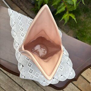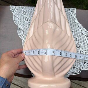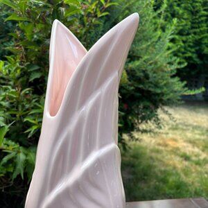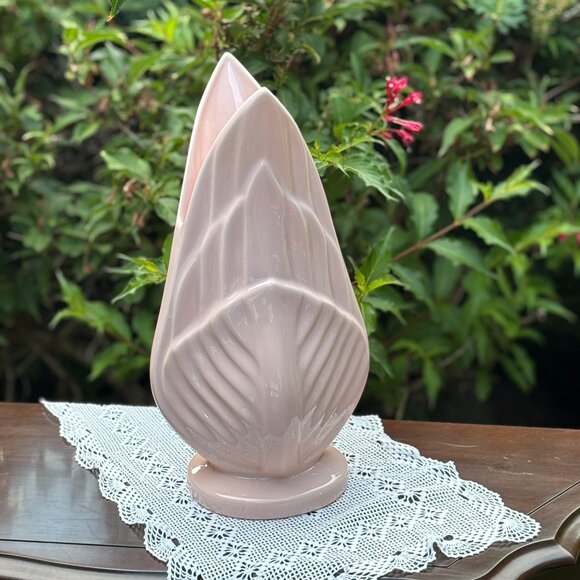 This large sculptural leaf vase in a soft pastel pink glaze is a showstopping accent for any space. Likely produced in the late 1980s to early 1990s, it features dramatic vertical curves, stylized leaf ridges, and an elegant glossy finish. The organic asymmetry and molded details give it a striking presence on mantels, entryway tables, or modern shelving. A bold retro piece for lovers of mid-century modern or glam vintage décor. Beautiful for tall florals or as a standalone art pottery display.