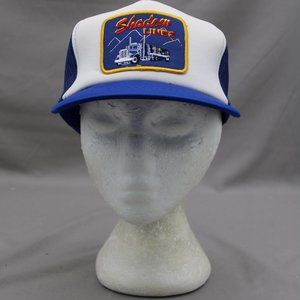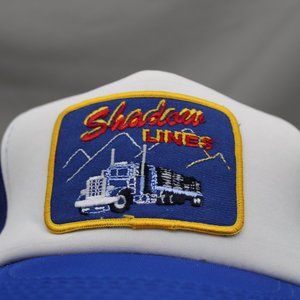 Up for sale is a vintage Patched tucker hat. This hat is for Shadow Lines of Langley BC. It features a blue base colour with white front. The front of the hat has a very stylish patch with semi truck on it and shadow lines above. What a very cool trucker hat perfect for everyday wear or as a stand out piece in any collection.