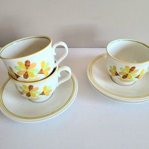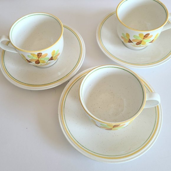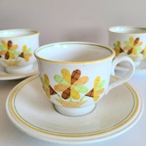 Vintage 1970-1980s Patches Versatone by Noritake Japan BE O2 W10 set of 3 cups with saucers. Cups are 2 3/4'' tall, 3.5'' wide. Saucers are 6 1/4'' wide. Great condition.