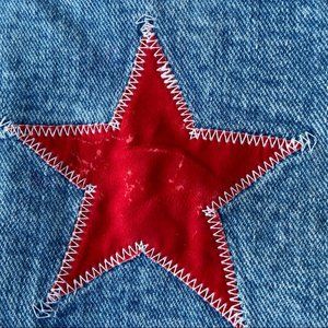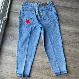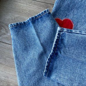 High rise mom jeans with adorable red star & heart patchwork accents. These have that classic, retro vibe with a cute little twist!