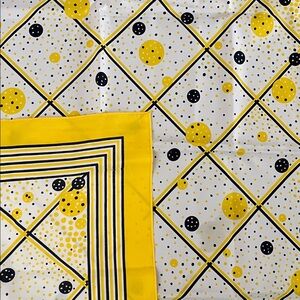 Yellow trim with black, white and yellow circles pattern throughout. Square scarf measuring approximately 26"; this is on the larger side of scarves that I own and great for versatile styling.