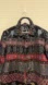 Stylish vintage jacket with intricate patterns. Features a mix of black, red, and gray colors. Perfect for a unique look. 3/5