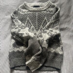 Lovely grey and white knit sweater! Thick, warm, and comfortable. Pattern kind of reminds me of the winter but good for any chilly season.